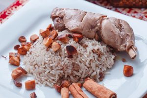 Arroz com carne moída, acompanhado de frango e castanha do Brasil.
