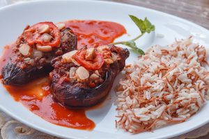 Berinjela recheada com carne moída, castanha do brasil e rodelas de tomate fresco. Acompanha arroz com aletria.