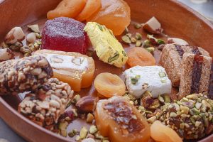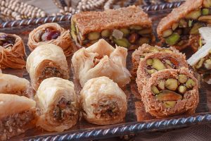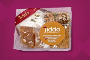 Caixa com variados tipos de doces árabes finos. O mix pode conter dedo de caju, baklava de pistache e de caju, kol wo shkor de pistache e caju, bokag de caju, namura, entre outros. 250g *mix pode variar conforme disponibilidade. Vai em uma linda caixa ideal para presente.