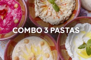 Combo de 3 pastas diversas. Você pode escolher entre nossas quatro opções: Babaganoush, Coalhada Seca, Homus e Homus com Beterraba. 540g