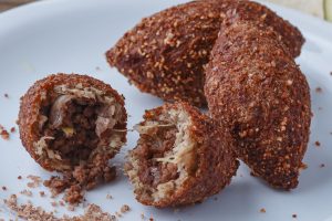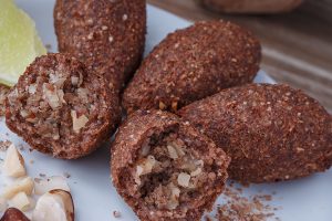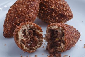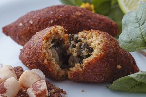 Quibe de trigo recheado com carne moída e castanha-do-brasil.