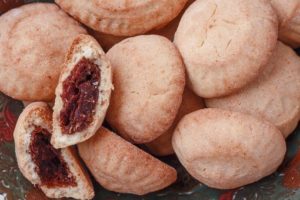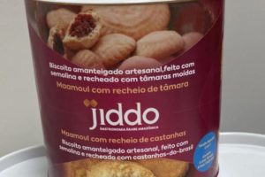 Biscoito amanteigado artesanal, feito com semolina e recheado com tâmaras moidas. Lata com 12 unidades. Os biscoitos vão em um linda lata ideal para presente.